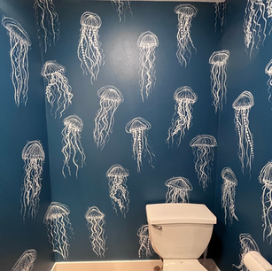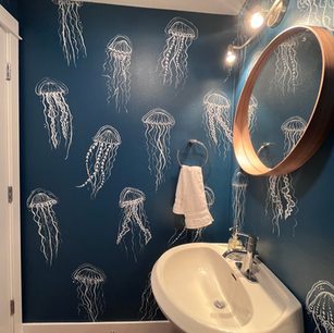 This mural was created for an Air BnB in Ballard, WA. It was designed to mirror the blues used in the rest of the decor. The client wanted to have an ocean theme, so I thought a clean jellyfish design would work perfectly. The client and guests love that the mural emulates a Renee Erickson vibe.