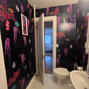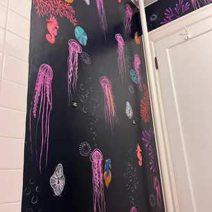 I created this for my client who wanted a playful and immersive underwater washroom for their children. We based the theme from their favorite movie, Finding Nemo. The client especially loved the seahorses and the neon effect of the hot pink jellyfish.