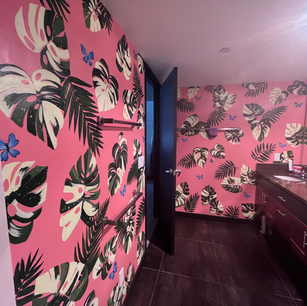 My client wanted a mural of leaves on a pink bathroom to catch the afternoon sunset sunlight that came into her bathroom. She loved the way the color made the bathroom feel warm and bright, and changed from pink to orange depending on the lighting. I painted variagated monstera and added electric blue butterflies for a touch of whimsy.