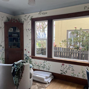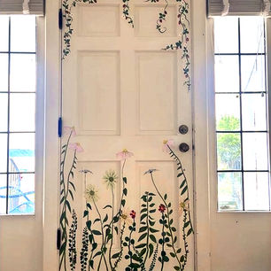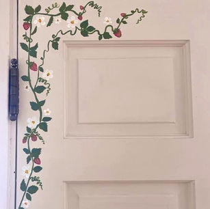 I created this for my client who wanted a natural, wallpaper feeling mural in their living room. They wanted it to feel unique, hand-painted, elegant and whimsical. I did sparse cherry tree blossoms that trailed onto the ceiling, trailing wildflowers, and even added some fun elements such as strawberry vines on the back of their front door and bleeding heart vines in a front door nook.