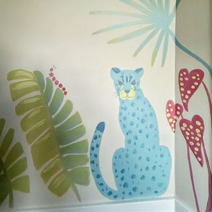 A client wanted a beautiful jungle themed mural for her baby boy who was on the way. I created a relaxing but colorful color palette and chose some happy animal friends to add in among the tropical leaves. The client loved the colors and the way the mural brought the babies' room to life!